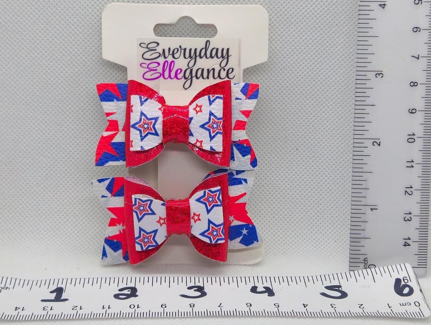 Designed and handcrafted by Elle, this unique bow set is made from faux leather and secured with Silver French barrettes.