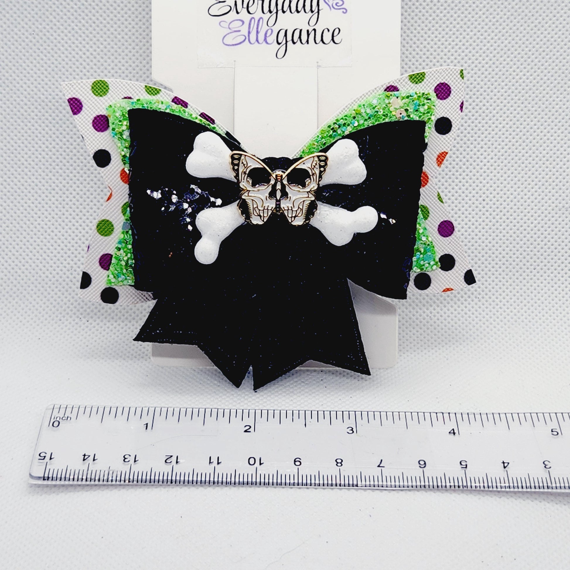 Halloween Sequined Polka Dot Skull and Crossbones Bow with a Butterfly Skull Accent