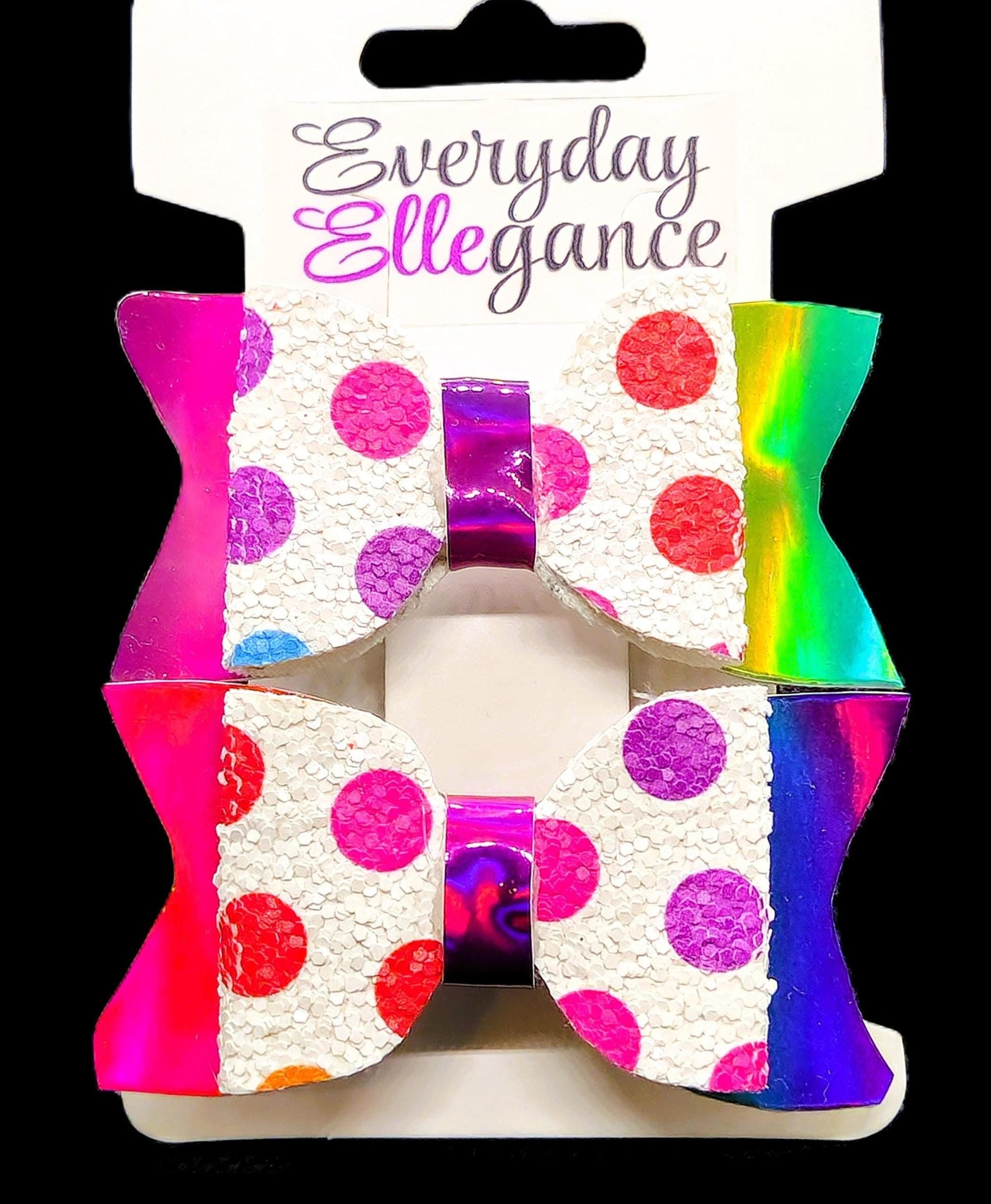 Designed and handcrafted by Elle, this unique bow set is made from faux leather and secured with Silver French barrettes.